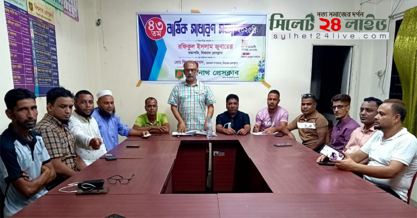 ঐতিহ্যবাহী বিশ্বনাথ প্রেসক্লাবের ৪৩ তম বার্ষিক সাধারণ সভা অনুষ্ঠিত হয়েছে। শনিবার রাতে বিশ্বনাথ প্রেসক্লাব কার্যালয়ে সংগঠনের সভাপতি রফিকুল ইসলাম জুবায়েরের সভাপতিত্বে ও সাধারণ সম্পাদক মোঃ শিপন আহমদের পরিচালনায় সভায় বক্তব্য রাখছেন বিশ্বনাথ প্রেসক্লাবের সাবেক সভাপতি তজম্মুল আলী রাজু, সাবেক কোষাধ্যক্ষ মাওলানা শহীদুর রহমান, সদস্য মোঃ নুর উদ্দিন, মোহাম্মদ নুরুল ইসলাম, আব্দুস সালাম মুন্না, সমুজ আহমদ সায়মন, সুজিত দেব, ফারুক আহমদ ও মাজহারুল ইসলাম সাব্বির। সভায় ক্লাবের বার্ষিক আয়-ব্যয়ের হিসেব উপস্থাপন করেন কোষাধ্যক্ষ মোঃ জামাল মিয়া। সভায় নতুন সদস্যদের অন্তর্ভুক্তি, বার্ষিক ক্রীড়া প্রতিযোগিতা, বার্ষিক বনভোজন, বার্ষিক স্মারক, বার্ষিক এওয়ার্ড, ৪৩ বছর পূর্তি স্মারক প্রকাশনার তারিখ, বিশ্বনাথ প্রেসক্লাব ওয়েলফেয়ার ফান্ডের বিষয়ে বিভিন্ন গুরুত্বপূর্ণ সিদ্ধান্ত গ্রহণ করা হয়।সভা শেষে বিশ্বনাথ প্রেসক্লাবের সাবেক কোষাধ্যক্ষ কানাডা প্রবাসী অসিত রঞ্জন দেবের সৌজন্যে বার্ষিক নৈশভোজ অনুষ্ঠিত হয়।
