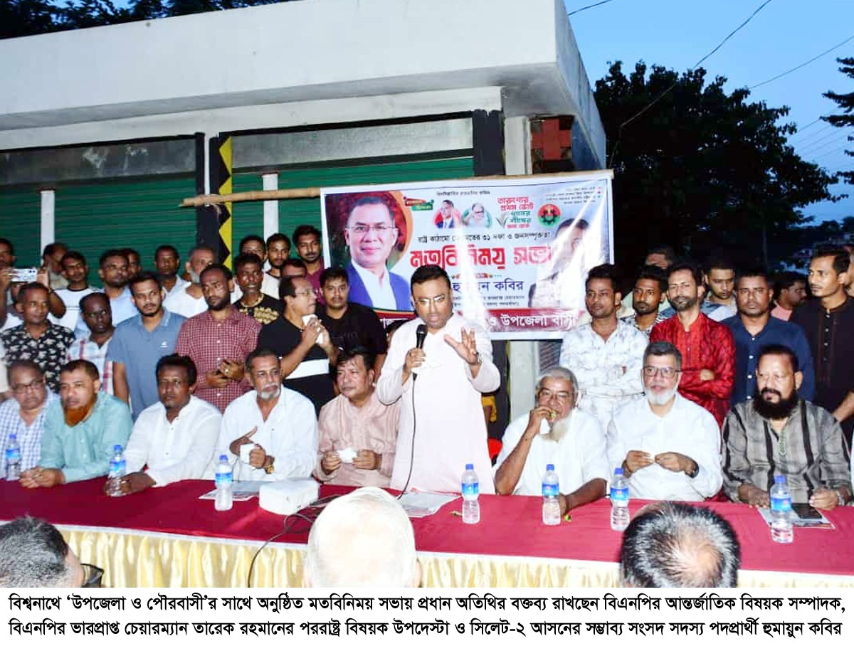 বাংলাদেশ জাতীয়তাবাদী দল (বিএনপি)’র আন্তর্জাতিক বিষয়ক সম্পাদক, বিএনপির ভারপ্রাপ্ত চেয়ারম্যান তারেক রহমানের পররাষ্ট্র বিষয়ক উপদেস্টা ও সিলেট ২ (বিশ্বনাথ-ওসমানীনগর) আসনের সম্ভাব্য সংসদ সদস্য পদপ্রার্থী হুমায়ুন কবির বলেছেন, দাবী-দাওয়া আদায় করতে হলে শক্ত হাতে করতে হয়। আর এরজন্য প্রয়োজন শক্ত জনপ্রতিনিধি। আপনারা নিশ্চিত থাকেন আপনাদের দাবী-দাওয়া আদায়ে দূর্নীতির উর্ধ্বে উঠে কাজ করব। তবে চলার পথে আমারও ভুল ভ্রান্তি থাকতে পারে, অবশ্য সেক্ষেত্রে ভালোর পাল্লাটাই বেশি থাকবে। তাই আসন্ন নির্বাচনে আমি সিলেট-২ (বিশ্বনাথ-ওসমানীনগর) আসন থেকেই নির্বাচন করতে চাই। এখন দল যদি আমাকে নমিনেশন দেয় এবং মহান আল্লাহ পাকের ইচ্ছায় নির্বাচিত হই তবে সরকারের পক্ষ থেকে ৬টি স্কুলের বরাদ্ধ আসে তাহলে আমি ওসমানীনগরবাসীর হাতে, পায়ে ধরে এই ৬টি থেকে বিশ্বনাথের জন্য ৪টি বরাদ্ধেও ব্যবস্থা করব। এই ত্রায়োদশ জাতীয় সংসদ নির্বাচনে তারেক রহমানের নেতৃত্বে বিএনপি ক্ষমতায় আসবে ইনশাল্লাহ। আর বিএনপি ক্ষমতায় আসলে আবারও এই আসনে বিপুল পরিমানের উন্নয়ন করতে পারবো।