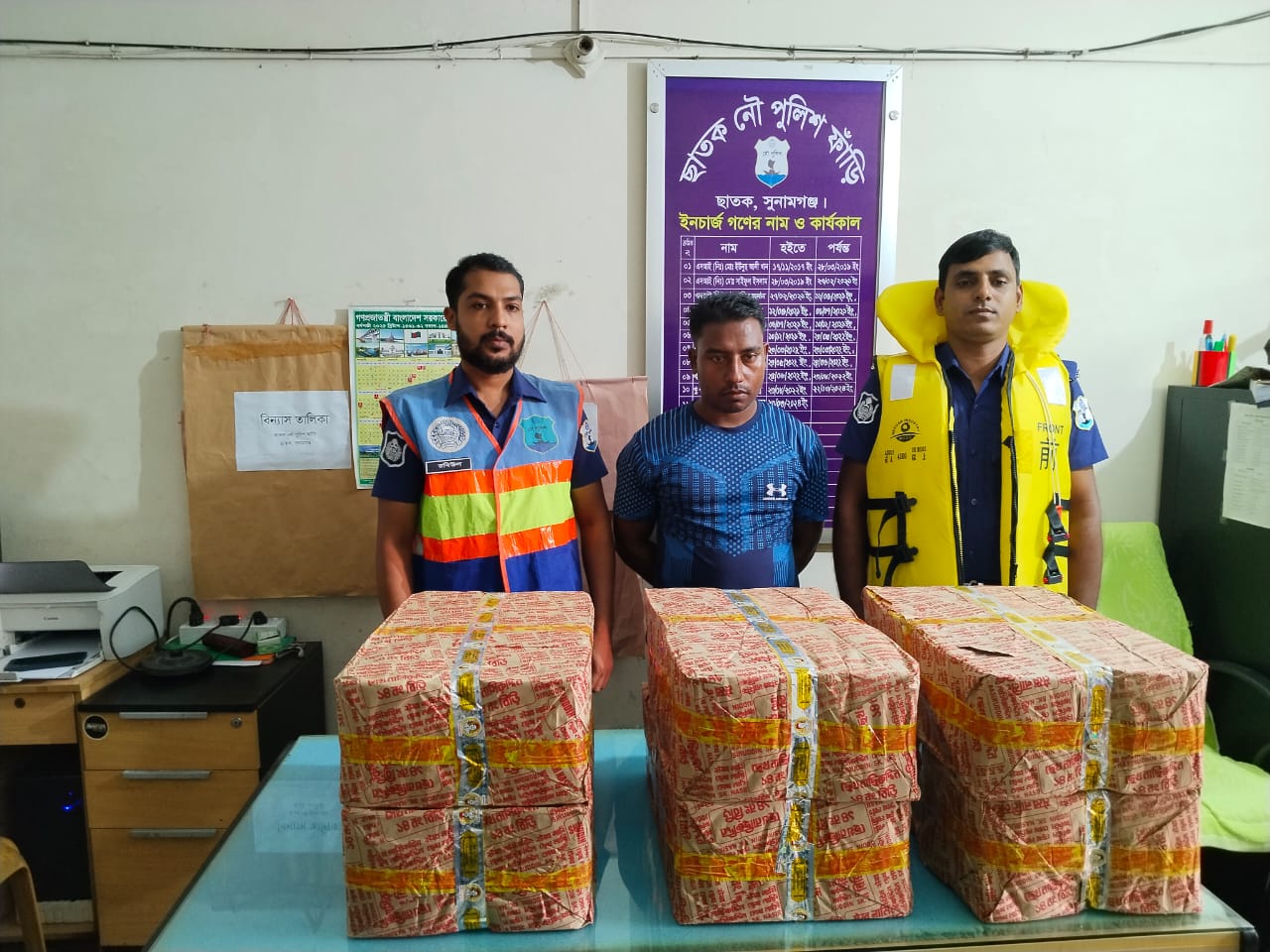 ছাতকে নৌ পুলিশের অভিযানে ৪২ হাজার ভারতীয় নাছির বিড়িসহ একজন কে আটক করা হয়েছে। ০৭ অক্টোবর মঙ্গলবার দুপুরে ছাতক নৌ-পুলিশ ফাঁড়ির এসআই মো. এরশাদ আলী ও এএসআই নাইমুন হাসান চৌধুরী সহ এই অভিযান পরিচালনা করেন। নৌ-পুলিশ সূত্রে জানা যায়, ছাতক থানার সুরমা নদীর দক্ষিণ পাড়ের কলাহাটা চৌধুরী ঘাট এলাকা থেকে এই বিপুল পরিমাণ ভারতীয় নাসির বিড়ি জব্দ করা হয়েছে। জব্দ ৪২,০০০ (বিয়াল্লিশ হাজার) শেখ নাছির উদ্দিন বিড়ির আনুমানিক মূল্য ৮৪,০০০ (চৌরাশি হাজার) টাকা।
